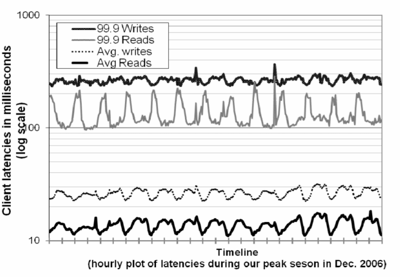 本文多处都将引用 P99.9 分布,这也显示了 Amazon 的工程师对提高用户体验所做的持续 不断的努力。一些基于均值的论文,我们会在它真正有意义的场景才拿出来作为比较,但我 们自己的工程和优化都不是以均值 SLA 为核心的。某些技术,例如 write coordinator(写操作协调者),是完全面向 P99.9 来控制性能的。