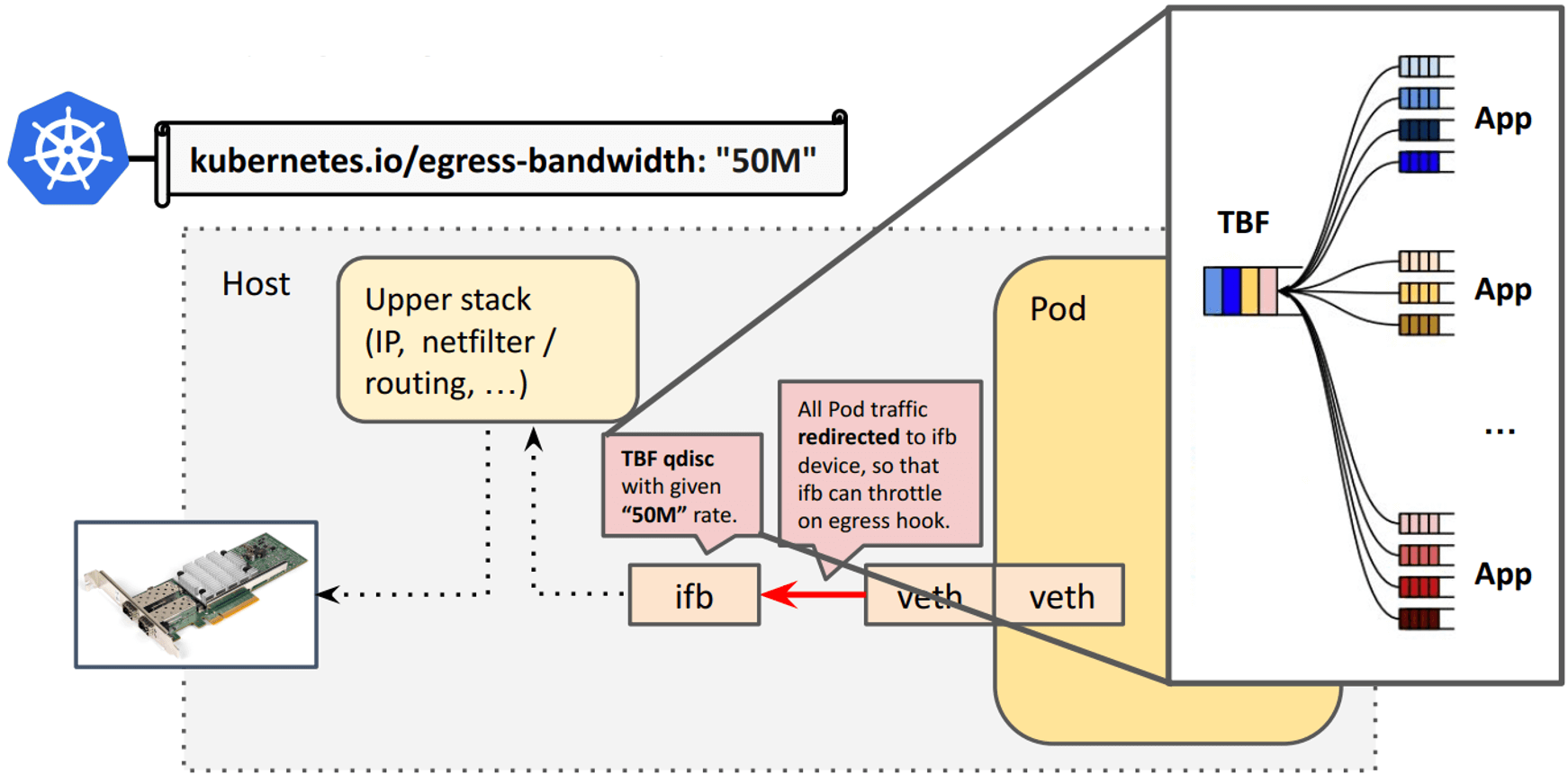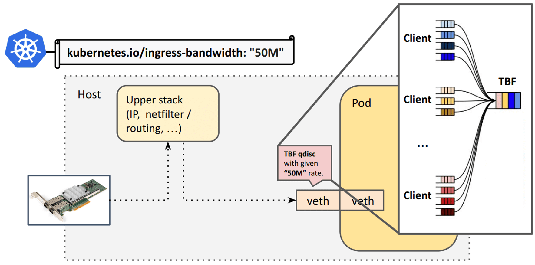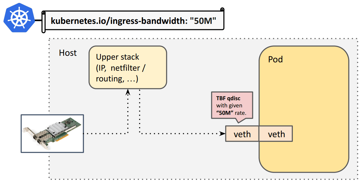 Fig. Bandwidth meta plugin 解析 pod annotation,并通过 TC TBF 实现限速