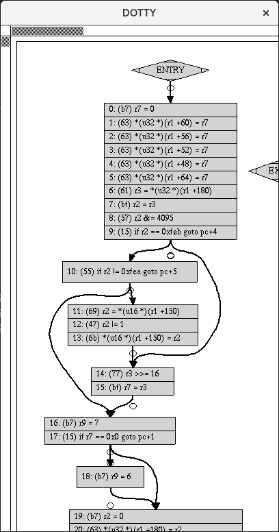 Jumps can be unconditional and conditional. Unconditional jumps simply move the program counter forward, so that the next instruction to be executed relative to the current instruction is off + 1, where off is the constant offset encoded in the instruction. Since off is signed, the jump can also be performed backwards as long as it does not create a loop and is within program bounds. Conditional jumps operate on both, register-based and immediate-based source operands. If the condition in the jump operations results in true, then a relative jump to off + 1 is performed, otherwise the next instruction (0 + 1) is performed. This fall-through jump logic differs compared to cBPF and allows for better branch prediction as it fits the CPU branch predictor logic more naturally. Available conditions are jeq (==), jne (!=), jgt (>), jge (>=), jsgt (signed >), jsge (signed >=), jlt (<), jle (<=), jslt (signed <), jsle (signed <=) and jset (jump if DST & SRC). Apart from that, there are three special jump operations within this class: the exit instruction which will leave the BPF program and return the current value in r0 as a return code, the call instruction, which will issue a function call into one of the available BPF helper functions, and a hidden tail call instruction, which will jump into a different BPF program.