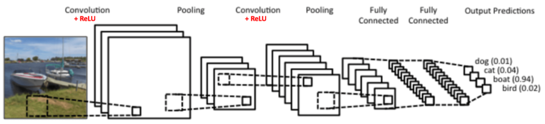 - 这个例子中会分成四类:dog, cat, boat, bird,所有概率的总和是 100%(后文会解释);