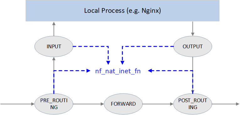 - modify it: e.g. replace network address (NAT), then push back to the original travesal path and let it go