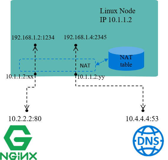10.1.1.2:55667 <-> 10.2.2.2.:80: locally originated connection for accessing external HTTP/TCP service10.3.3.3:23456 <-> 10.3.3.2.:21: externally originated connection for accessing FTP/TCP service in this node10.1.1.2:33987 <-> 10.4.4.4.:53: locally originated connection for accessing external DNS/UDP service