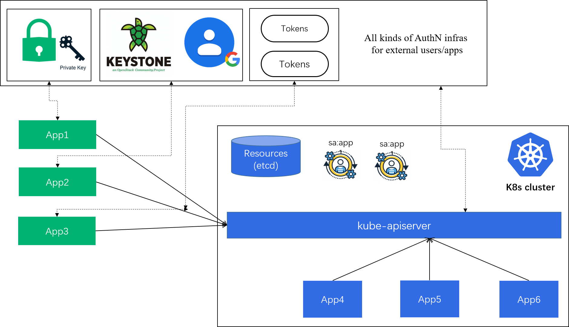 - Support both external users (e.g apps deployed in OpenStack or bare metal systems) and internal users (e.g. accounts created and managed by Kubernetes cluster itself);