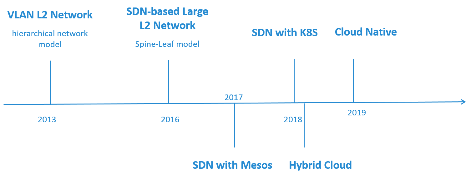At 2016, we evolved to a SDN-based large L2 network, and the underlying HW network evolved to Spine-Leaf model.