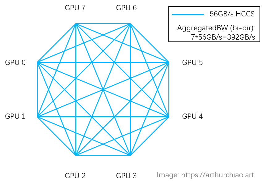 很多资料都说 910B 的卡间互连带宽是 392GB/s,看起来跟 A800 的 400GB/s 差不多了, 但其实还是有区别的,主要是互连拓扑不同导致的,详见 [1]。