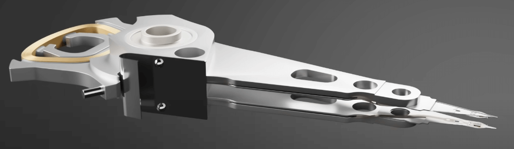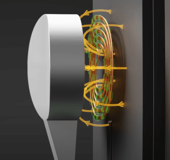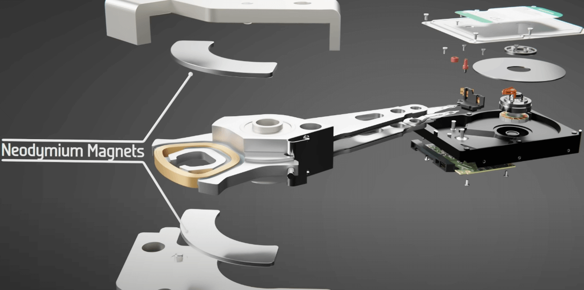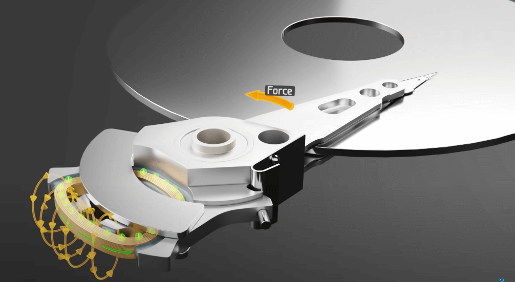 机械臂的尾部有一个 音圈电机(voice coil motor),或称音圈马达,它由线圈(coil of wire)和上下两个强钕磁铁(strong neodymium magnets)组成,