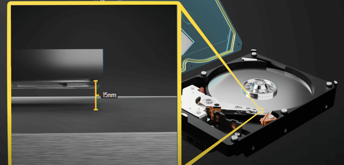 Fig. 读写头正常运行时,距离盘片仅 15nm。