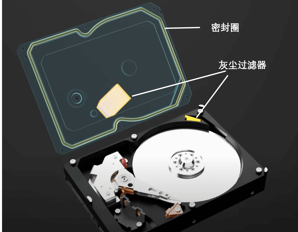 密封和过滤都是非常必要的,因为读写头距离盘片仅 15nm, 而灰尘颗粒的大小可达 10,000nm, 如果与 7200rpm 高速旋转磁盘碰撞,可能会造成严重损坏,