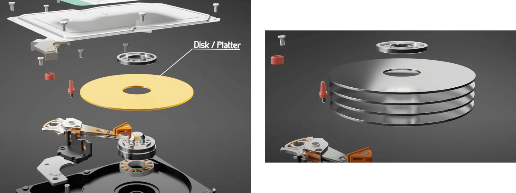 • 根据存储容量的不同,硬盘可能会有多个盘片堆叠,如上面右图所示;