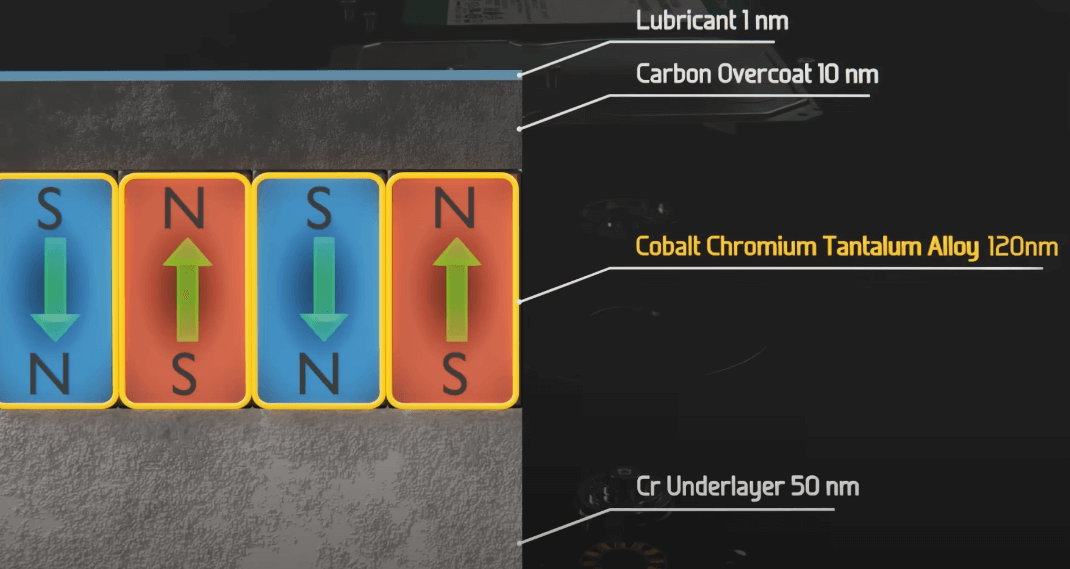 • 磁性功能层是 120nm 的钴铬钽合金薄层(cobalt chromium tantalum alloy), 它由磁性微块组成,磁极方向能变,