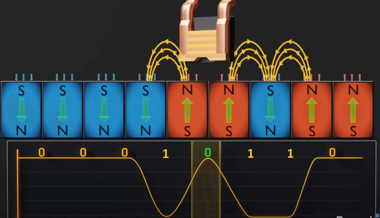 实际的 read head,检测的是相邻两个微块的磁极变化, 这是因为磁极变化的强度单个微块的磁场强度要大得多,所以这种方式的检测准确率非常高