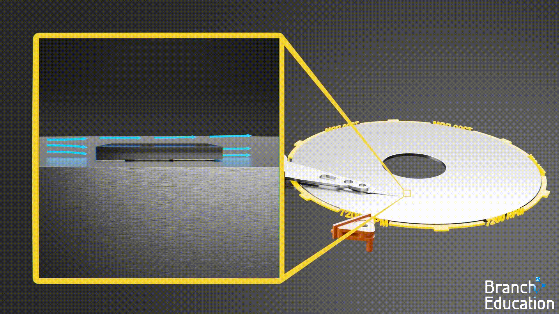 磁盘高速旋转产生的气流能使这个滑块(和读写头)浮起来, 稳定运行在离磁盘表面 15nm(约 100 个原子)的地方,如下面的动图所示,