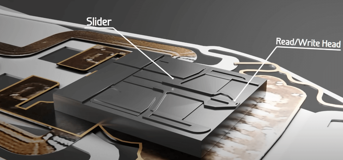 每个臂的末端有一个称为 slider(滑橇、滑块)的模块,它里面又包括了一个读/写头 (注意,读头和写头是分开的两个部件,后面会详细介绍),