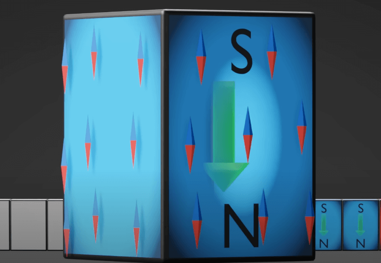 磁化之外,微块内原子的南北极是随机的; 磁化之,微块所有原子的北南极都指向同一方向,