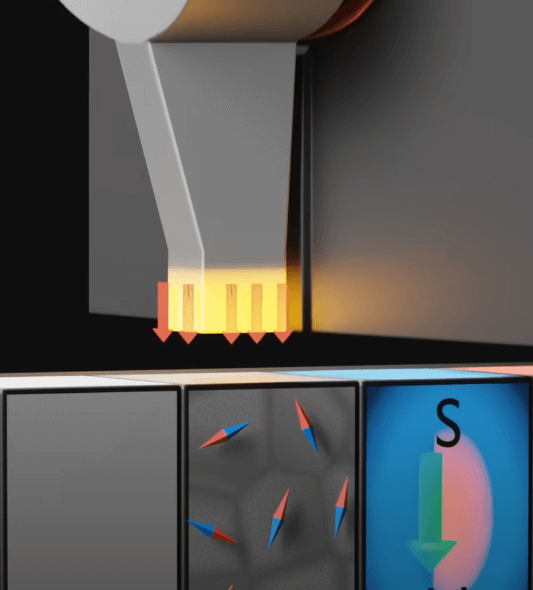 这个磁场沿着 write head 向下,聚焦到尖端的一个小点,改变它正下方的磁盘微块极性 (中间的缝隙就是前面提到过的读写头 15nm 悬浮高度),
