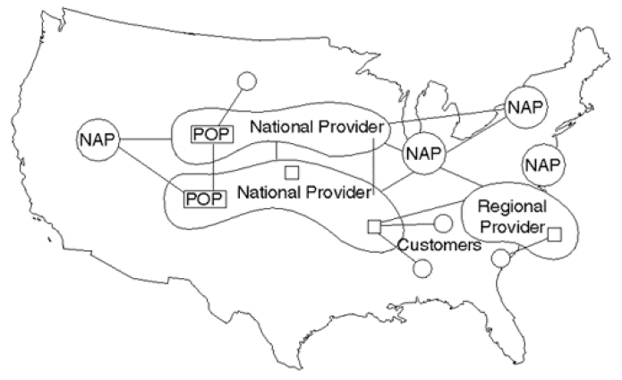- 多个区域网络(regional networks)和对等网络(peer networks),