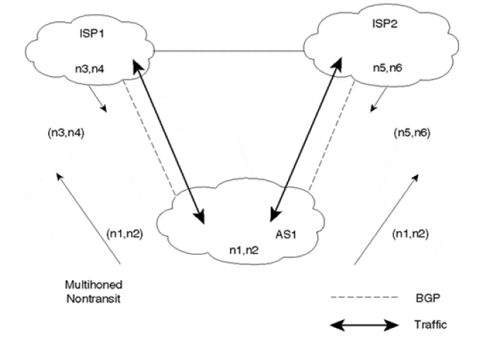 则,当 ISP1 和 Foonet 的网络发生故障之后,目的是 198.32.1.1 的流量从 ISP2 到达 ISP1 时,会匹配到默认路由,流量会绕回 ISP2,形成环路。