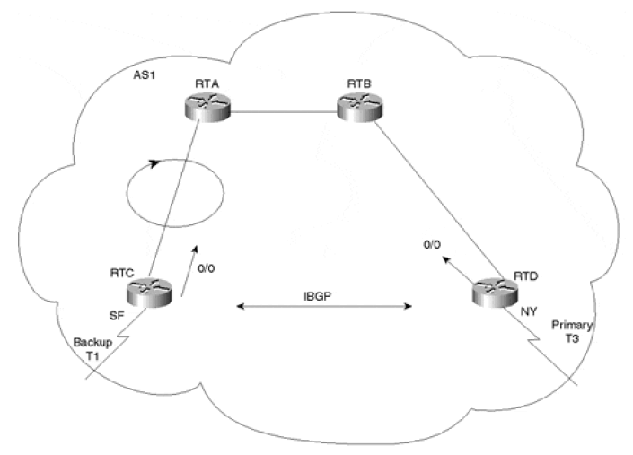 如果 BGP 策略是 RTD 做主,RTC 做备,那 RTC 收到流量时,会转发给 RTD,但因为 RTC 和 RTD 不是直连的,因此它会先转发给 RTA。RTA 根据 IGP 学习到的默认路由是 RTC,因 此它又会将流量转发回 RTC,形成了路由环路。