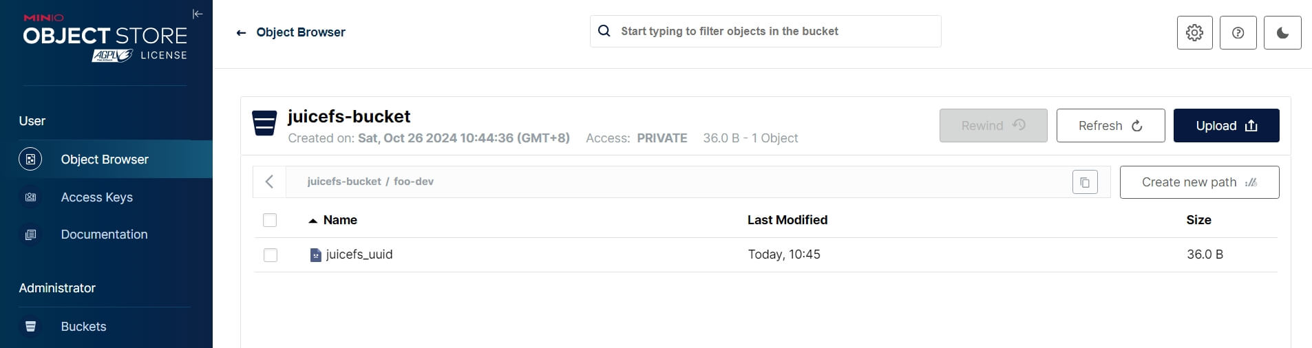 • 这些都是 volume 本地文件,不会上传到 MinIO。此时,MinIO juicefs-bucket 里面还是只有一个 uuid 文件。