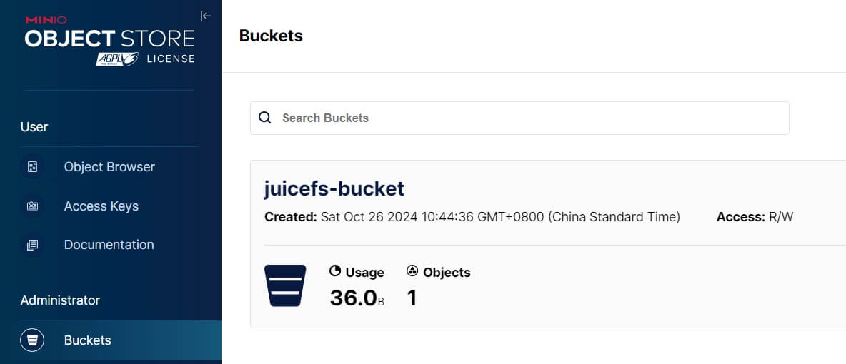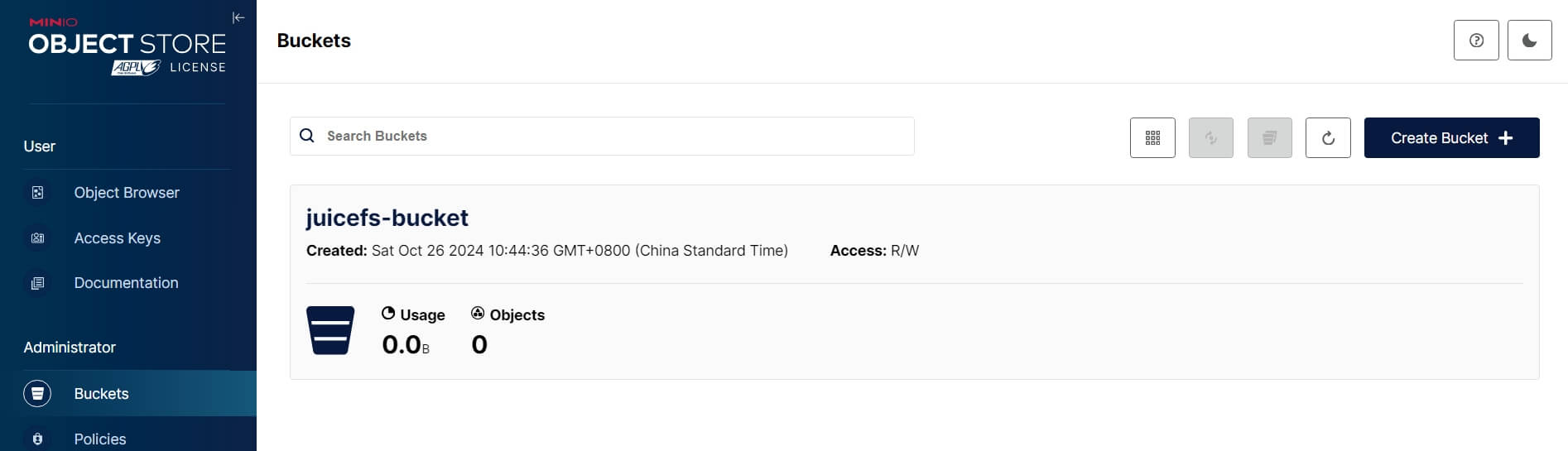 通过 MinIO 管理界面创建一个 bucket,这里我们命名为 juicefs-bucket