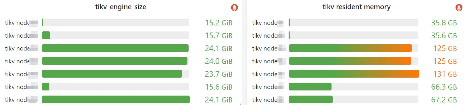 下面的监控展示是 7 台 TiKV node 组成的一个集群,各 node 内存不完全一致: 3 台 256GB 的,2 台 128GB 的,2 台 64GB 的, 可以看到每个 TiKV server 确实只用了各自所在 node 一半左右的内存: