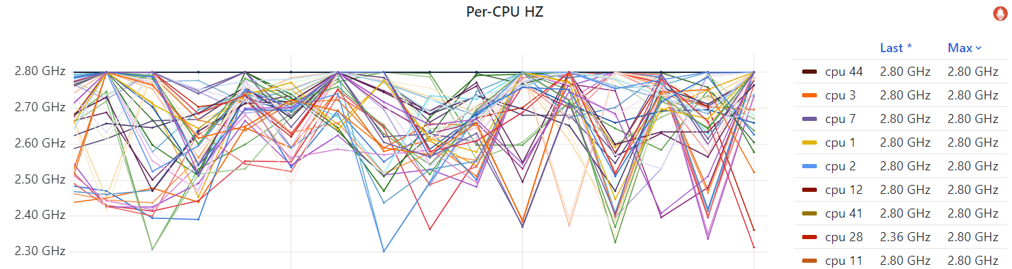 不同厂商设置的 max freq 可能不一样,比如 DELL 设置到了 3.9G(max turbo), 其他两家设置到了 2.8G(all-core turbo),上面监控可以看出来;下面这个图是最大频率和能运行在这个频率的 CORE 数量的对应关系: