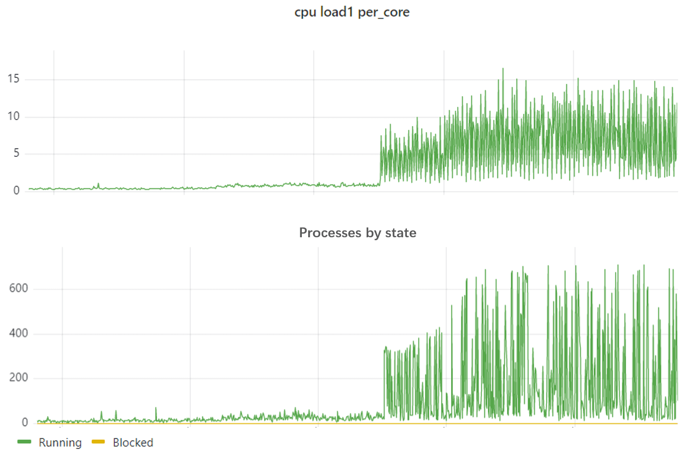 可以看到 running 进程数量在几十到几百之间剧烈波动。这里的 running 和 blocked 数量采集自: