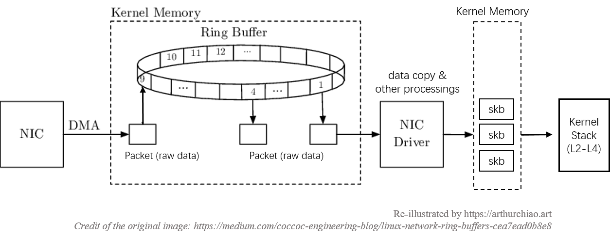 3. 网卡:通过 DMA 将包复制到内核内存中的 ring buffer