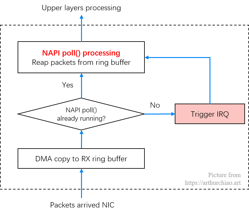 4. 网卡:如果此时 NAPI 没有在执行,就产生硬件中断(IRQ),通知系统收到了一个包(否则不用额外 IRQ 就会把包收走);触发软中断;