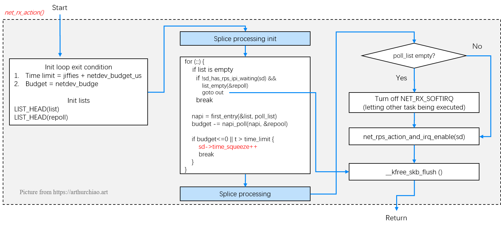 6. 内核:软中断处理,调用 NAPI 的 poll() 从 ring buffer 收包,并以 skb 的形式送至更上层处理;