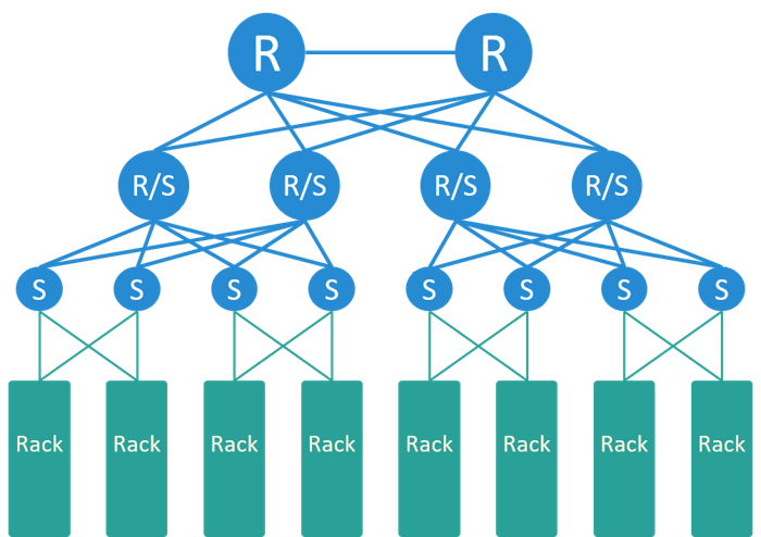 - 横向扩展性非常好:任何一层有带宽瓶颈,只需要添加一台新设备,然后和另一层的所 有设备连接起来。