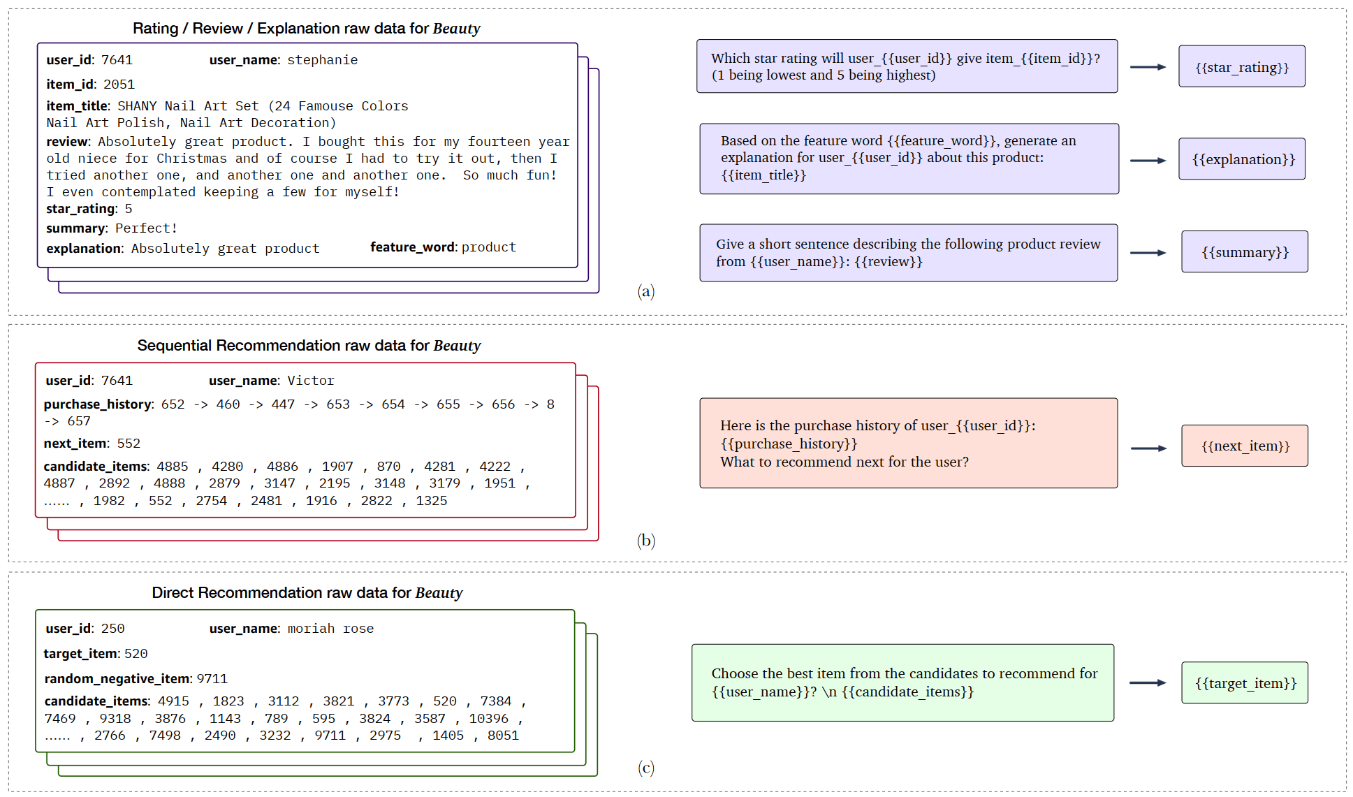 - 在 P5 中,所有数据 (user-item interactions, user descriptions, item metadata, user reviews 等)都被转换为统一的自然语言序列。