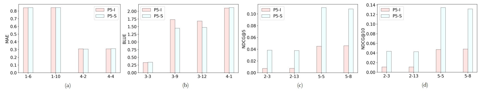 P5-I 在顺序推荐和直接推荐任务(all prompts in Figure 6 (c) & (d))上显著低于 P5-S,差距很大。