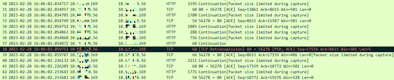 • #34 ~ #36 not ACK-ed by server either, but the client skipped them and retransmitted the last segment (#38) directly;