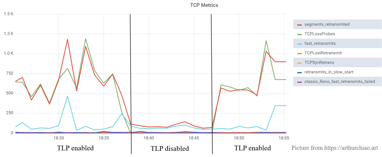 Modern kernels by default enable a TCP option called Tail Loss Probe (TLP), which actively sends the so-called “probe” packets to achieve TCP fast recovery. A side effect is that a large part of those probe packets is classified into TCP retransmissions (in good quality networks such as data center networks), which may be misleading for networking stack monitoring and troubleshooting, and leaving “TCP retransmission” a less useful indicator to network quality.