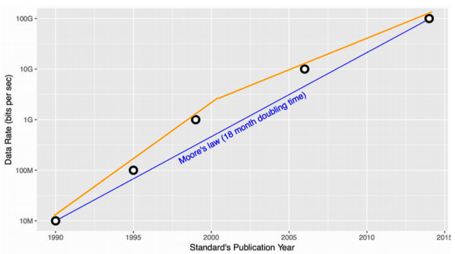 技术层面上,从摩尔定律看以太网的发展,明显能看到两段曲线: