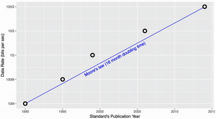 Fig. 以太网 25 年的带宽变化,从 10Mbps 增大到了 100Gbps