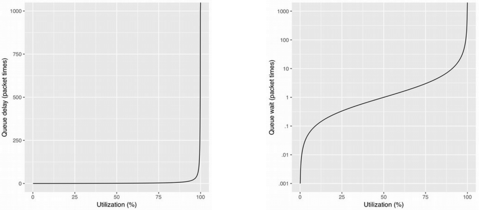 刚才提到,这种机制的前提是发送瓶颈在主机端,因此主机发送多快都没关系, 不用担心会把主机外面的什么设备或网络路径打爆。 这就意味着,主机端(更准确地说是此时的瓶颈)有时 —— 甚至是长时间 —— 运行在 100% 的。 更具体地说,你可能用的是线速 10Gbps 的网卡,但主机上的应用流量太大了, 导致以上 shaper 长时间把速度限制在 10Gbps,超过 queue 的包只能丢弃了。 排队论(queuing theory)也从数学上告诉我们,这是不稳定的(e.g. for M/D/1):