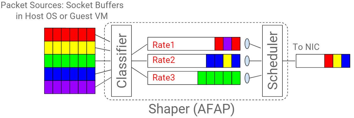 - 分类之后的流量分别放到不同的 queue(缓冲队列),各 queue 的发送速率限制可能是不同的;