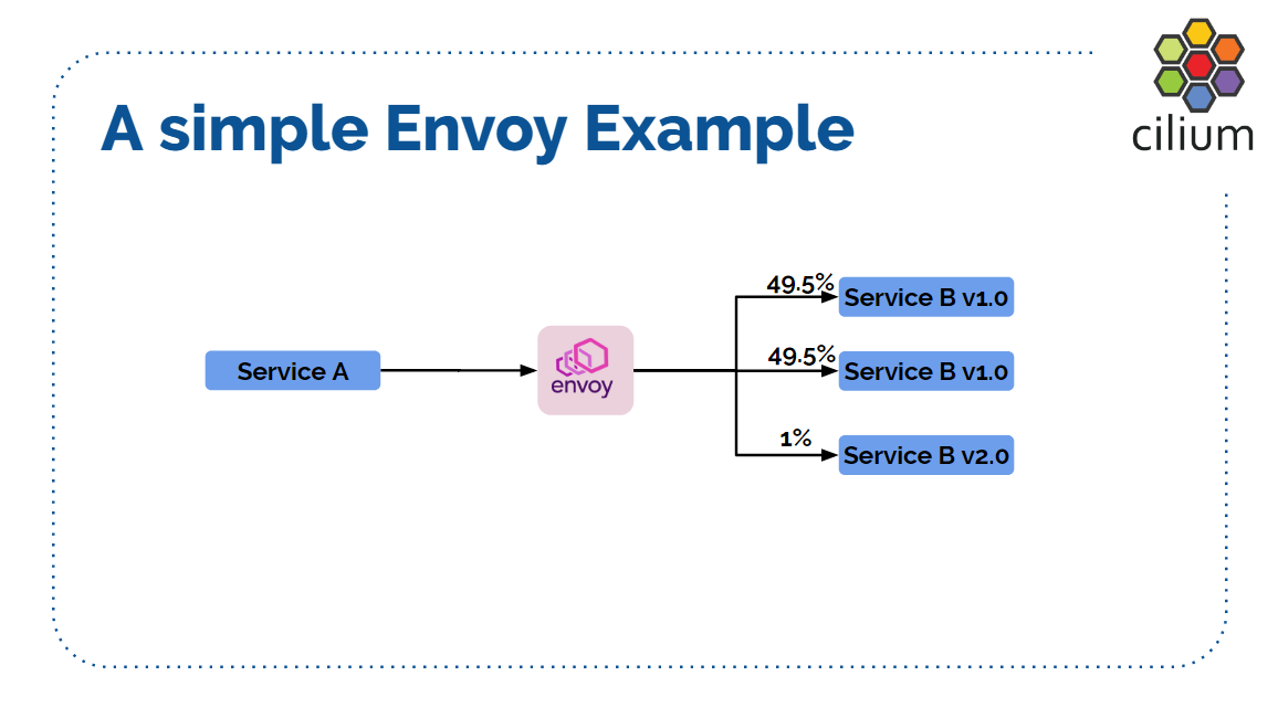 两个服务 A 和 B。服务 B 当前是 1.0 版本,A 和 B 之间是 Envoy,通过负载均衡功能 将 50% 的流量分别打到 B 的两台机器。