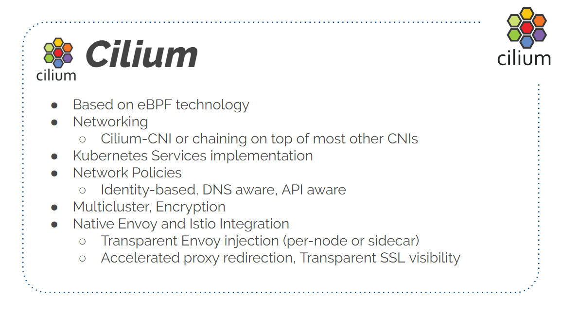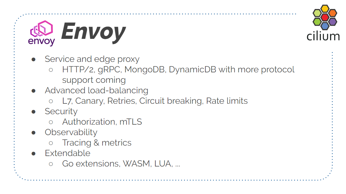 其次,用到 Cilium。运行在 Envoy 的下面,作为 CNI plugin 和 Load Balancing plugin。
