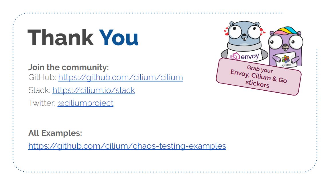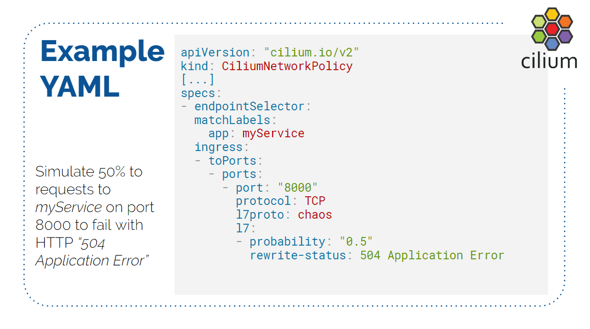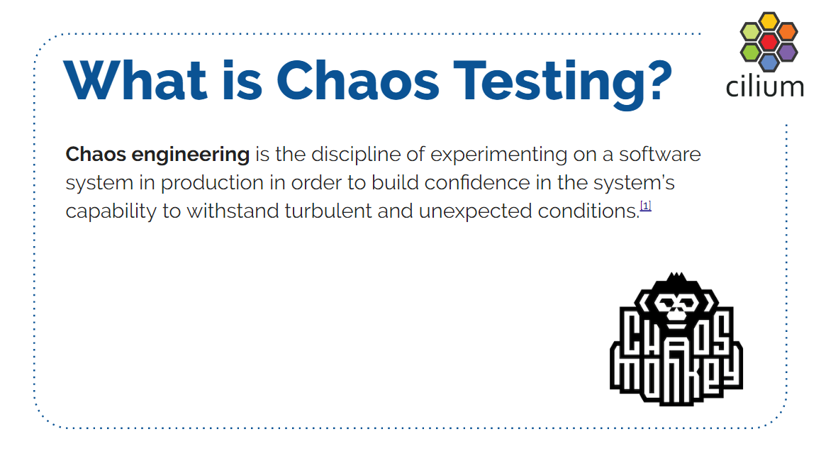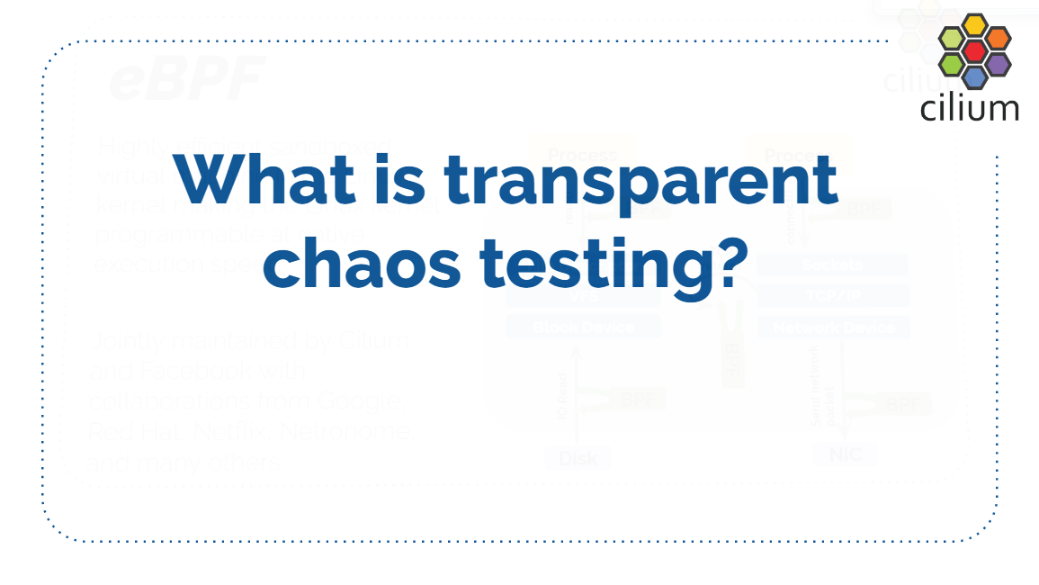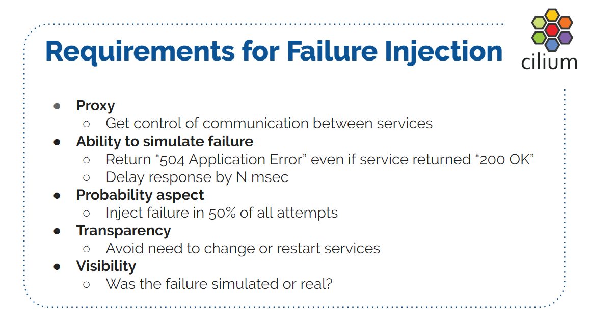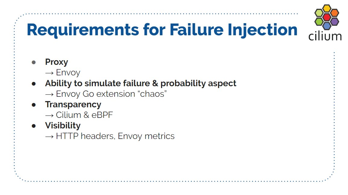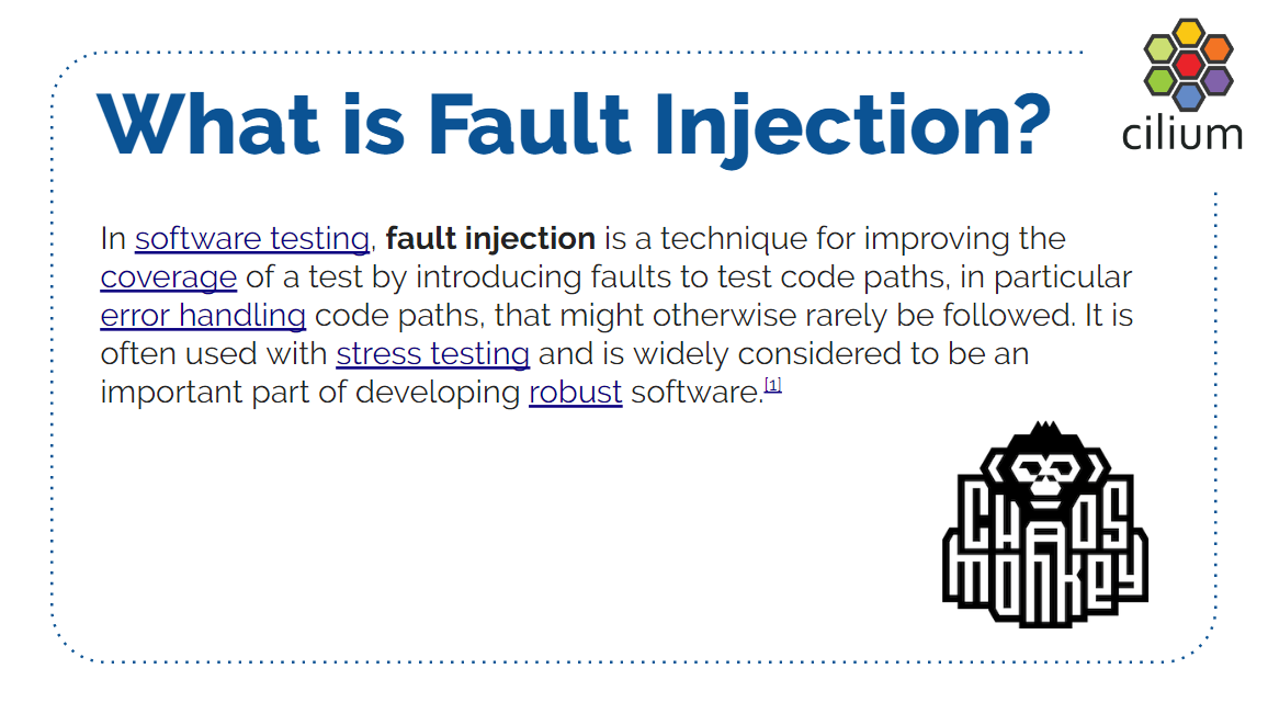 本文内容来自 2019 年的一个技术分享 Transparent Chaos Testing with Envoy, Cilium and eBPF ,演讲嘉宾是 Cilium 项目的创始人和核心开发者,演讲为英文。 本文翻译了其中的技术性内容,少量非技术内容(例如开场白)已略过。如有疑 问,请观看 原视频PPT