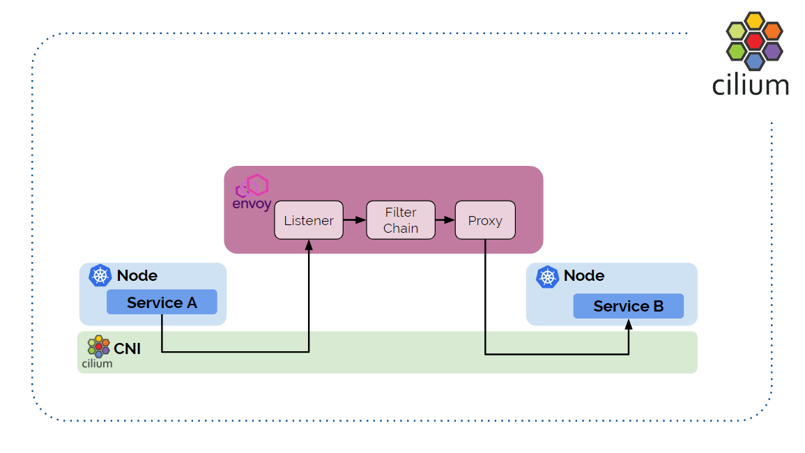 之所以称为透明是因为 A 和 B 都感知不到 Envoy 的存在。Cilium 会用 eBPF 这项黑 科技,魔法般地将请求重定向到 Envoy。透明意味着我们无需 sidecar 注入,或者运行其 他服务来拦截流量或请求,只需配置 Cilium。