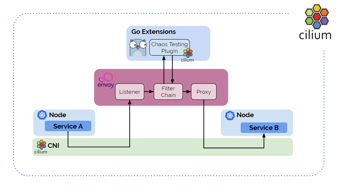 我们使用 Envoy 作为中间代理;并通过名为 chaos 的 Go Extension 完成了故障注入和 错误率设置;Cilium 和 eBPF 在其中承担了关键角色,实现了对应用的透明;最后,整个 过程是易于观测的,例如我们可以看到 HTTP 头、Envoy 监控指标等等。