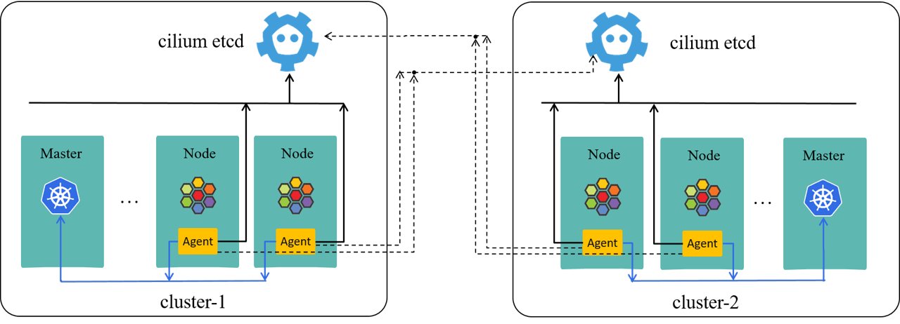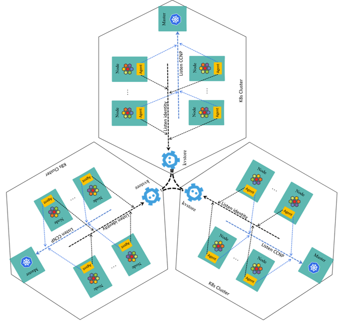 all the cilium-agents will be notified that there is a pod created in Kubernetes cluster1, namespace default, with PoIP, NodeIP, NodeName, pod label and identity information in the entries.