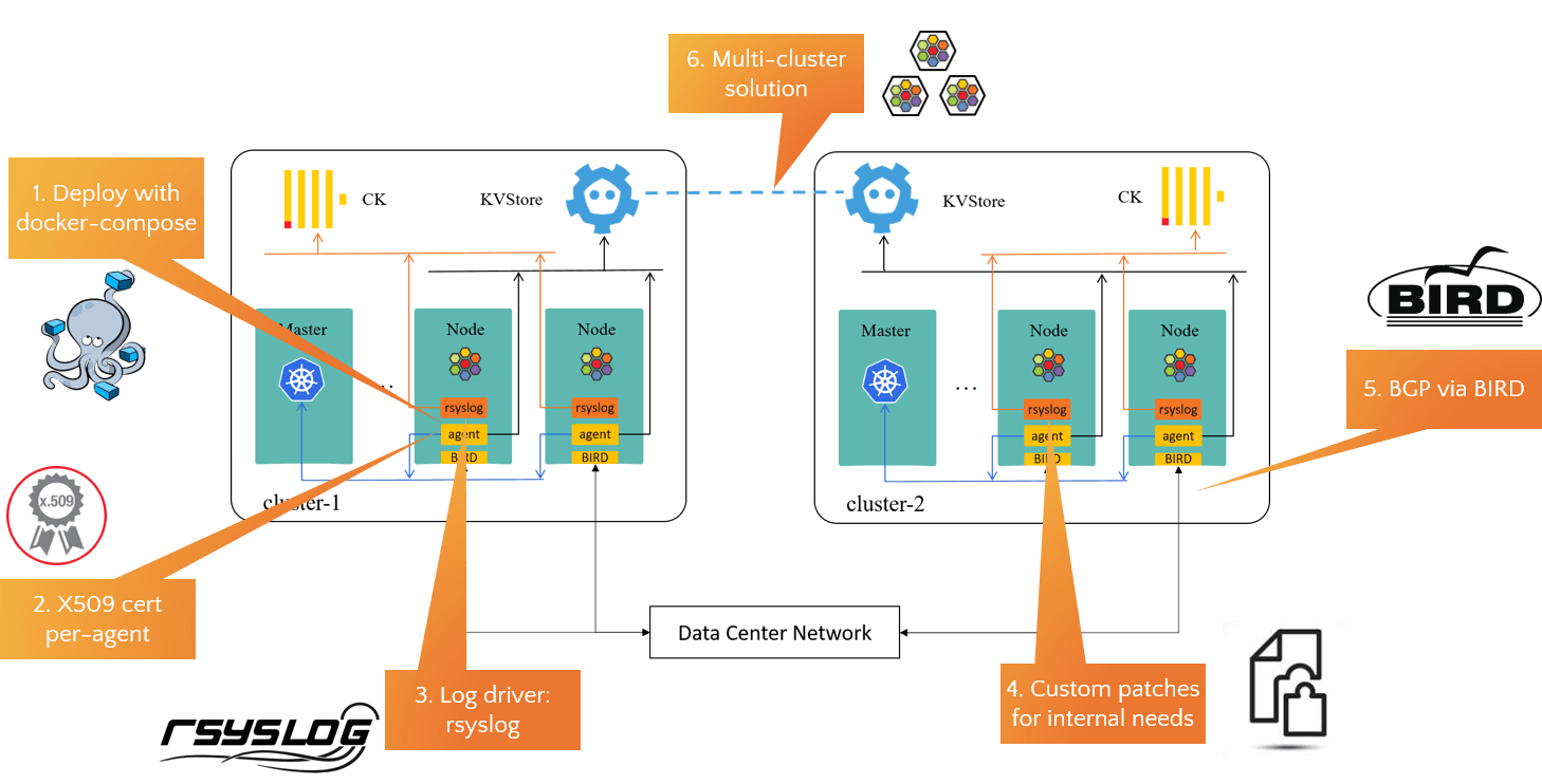 • And for inter-host networking, we use BGP for on-premises clusters and ENI for self-managed clusters on the cloud.