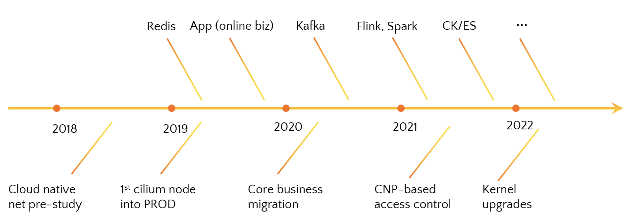 In Trip.com, we rolled out our first Cilium node (bare metal) into production in 2019. Since then, almost all our Kubernetes clusters - both on-premises baremetal and self-managed clusters in public clouds - have switched to Cilium.
