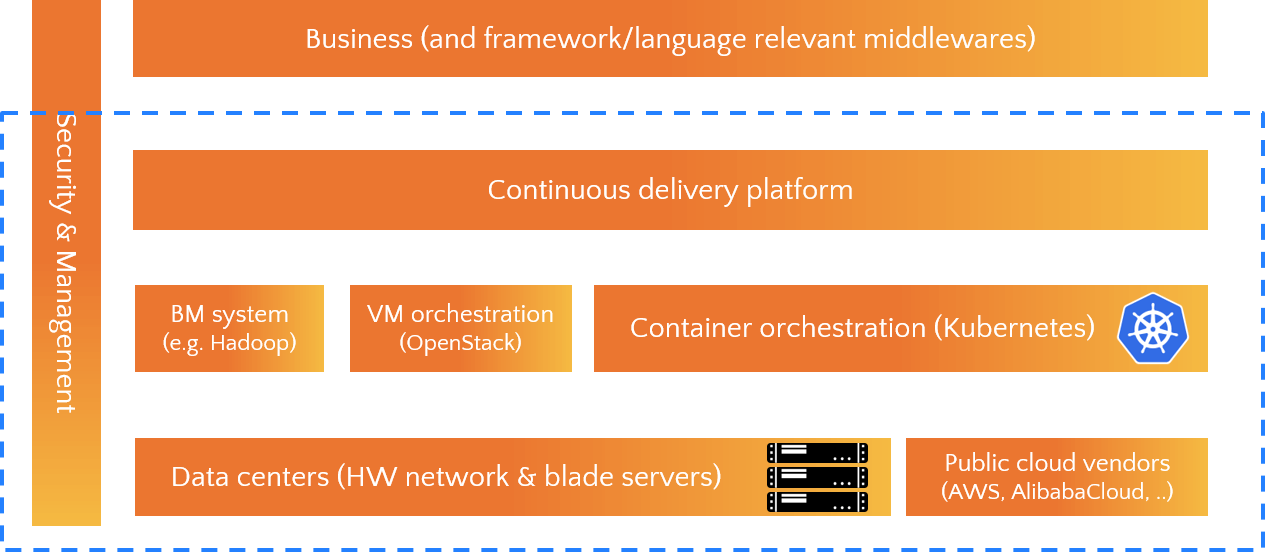 • Above the bottom is our orchestration systems for BM, VM and container;