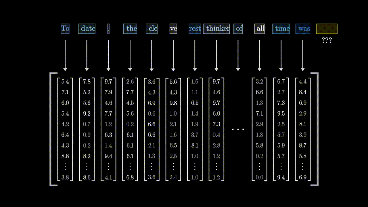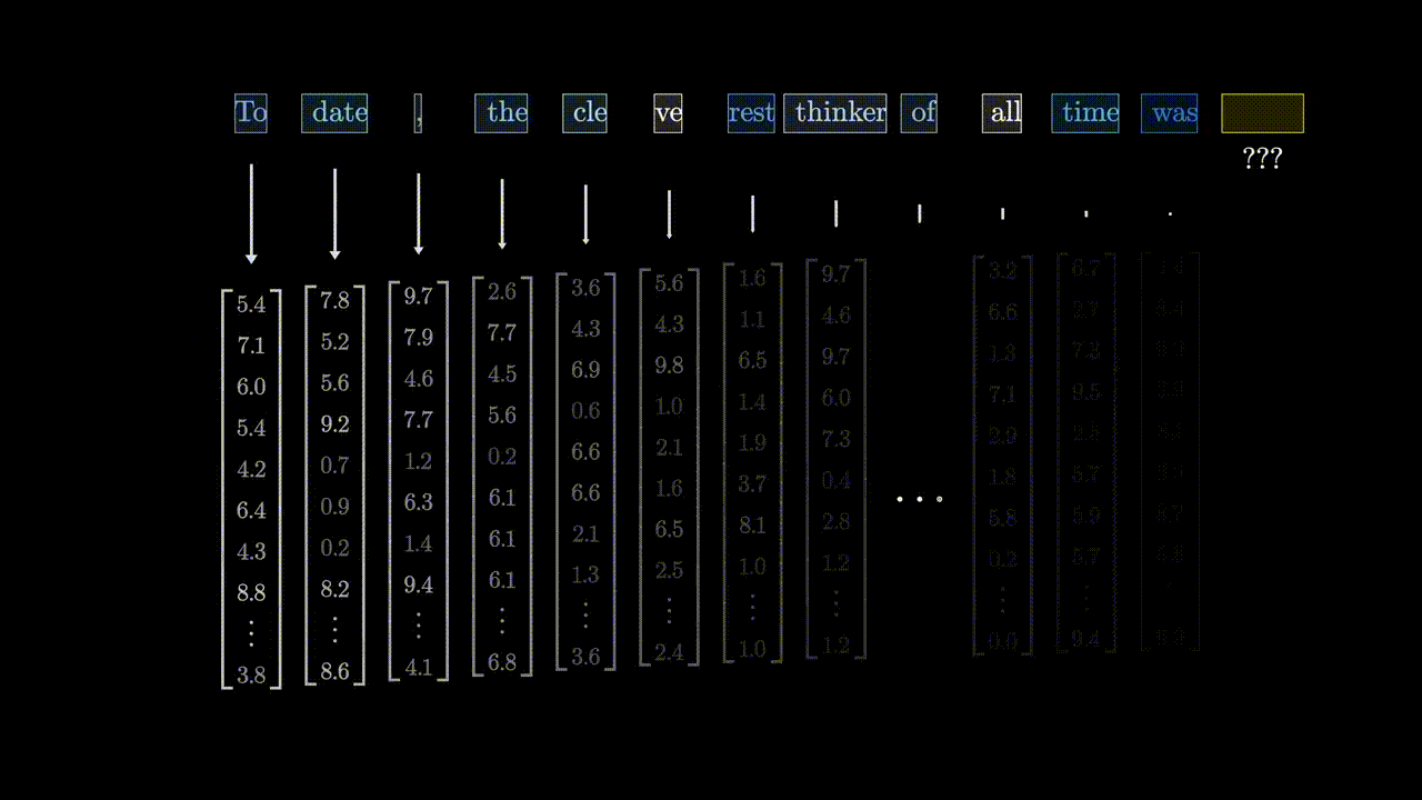 图:原始输入为 "To date, the cleverest thinker of all time was",让模型预测下一个 token。经过多层 attention + feed-forward 之后, 最后一层输出的最后一个向量已经学习到了输入句子表达的意思,(经过简单转换之后)就能作为下一个单词的概率。