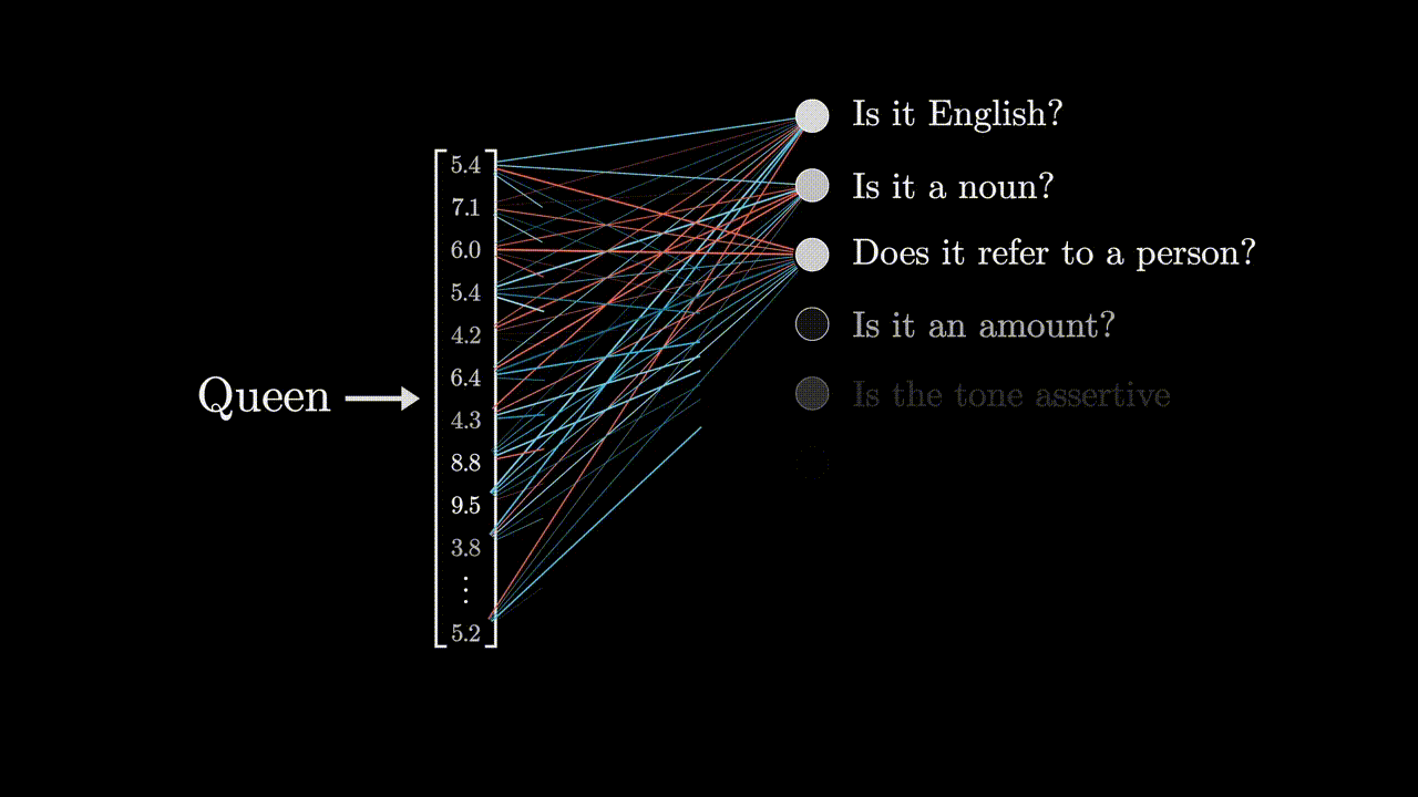 后面会看,从直观上来说,这个步骤有点像对每个向量都提出一组同样的问题,然后根据得到的回答来更新对应的向量: